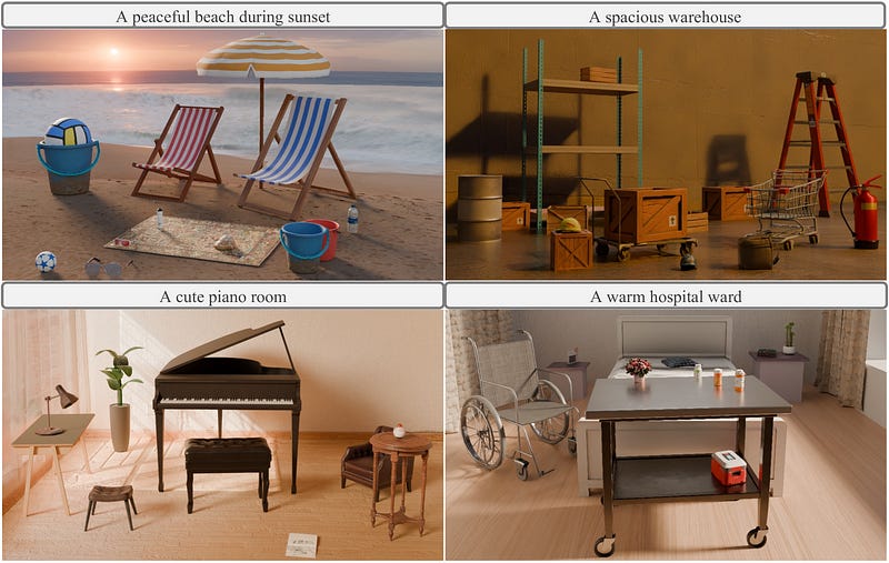 Recent deep learning approaches using auto-regressive models and diffusion methods enable end-to-end 3D layout generation but rely on object-annotated datasets like 3D-FRONT. These datasets are small in scale, limited to indoor environments, and often contain collisions. They primarily model large furniture layouts while neglecting smaller objects and their functional interactions.